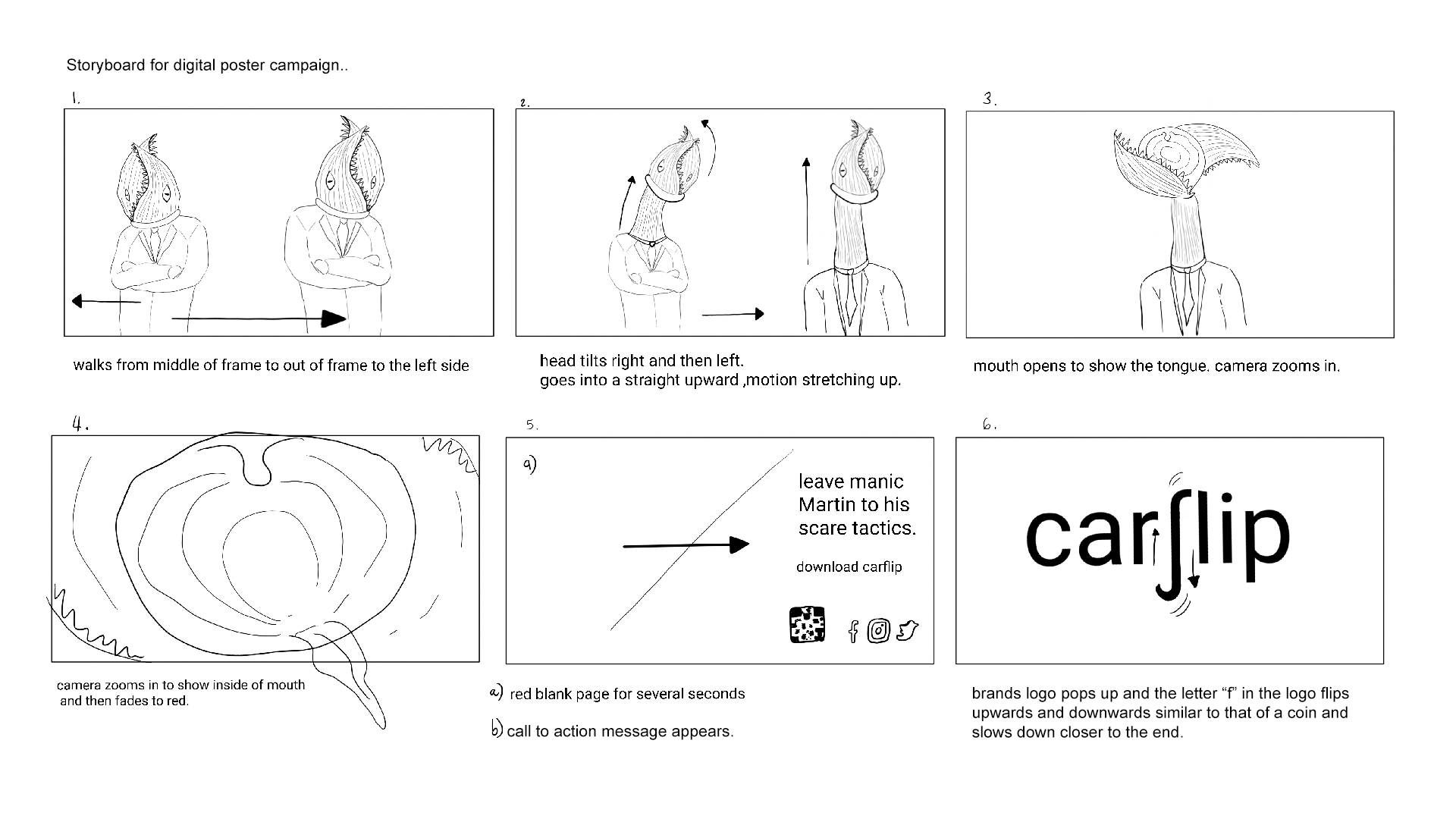 Create a Brand Launch for a new and upcoming Online Car Buying/Selling Service which will define and develop a go-to-market strategy to help launch the CarFling brand into the consumer market and drive towards becoming the “Go To Car Buying Service”. I animated the brand logo to create a sense of movement, where the “f” in Carflip, flips like a coin, slowing down and then stopping as well as illustrating the Storyboard for the digital poster animation to confirm the final execution, and the poster and monster scamps in the beginning stages which we took further into the campaign.