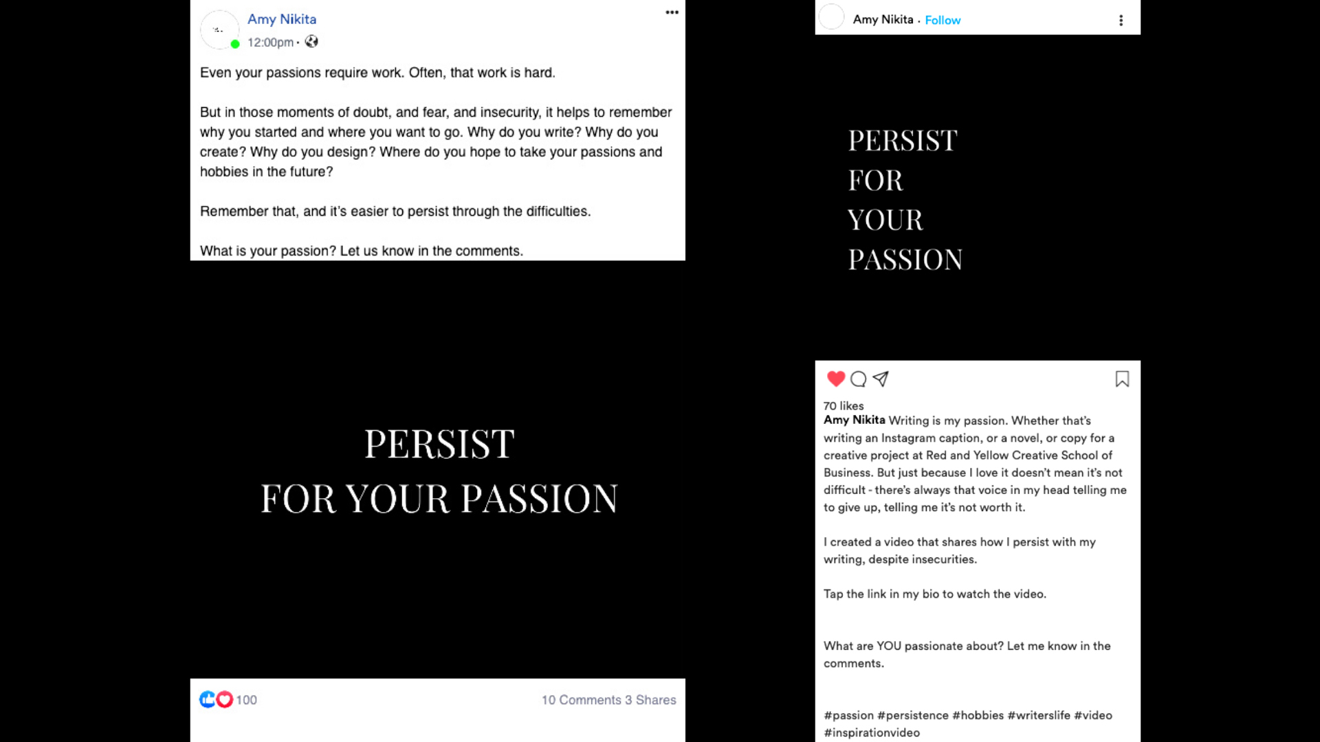 The brief was to conceptualise, draw up a storyboard, write the script for and perform post-production on a content video that communicates how one of Red and Yellow’s values resonates with me. This video would be published on social media.