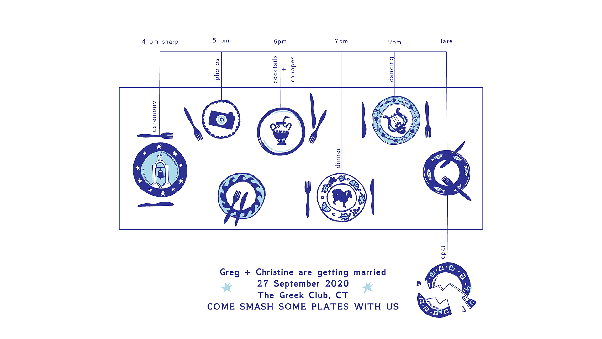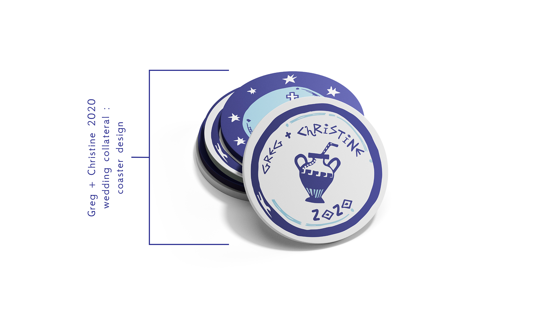 This infographic design serves as an invitation to a Greek Wedding, and uses Ancient Greek iconography in a tongue-in-cheek way. The wedding gift is a coaster, printed with the circular icon designs on them. I vectorized ink sketches to create the icon designs, so it still has a hand-drawn look and feel.