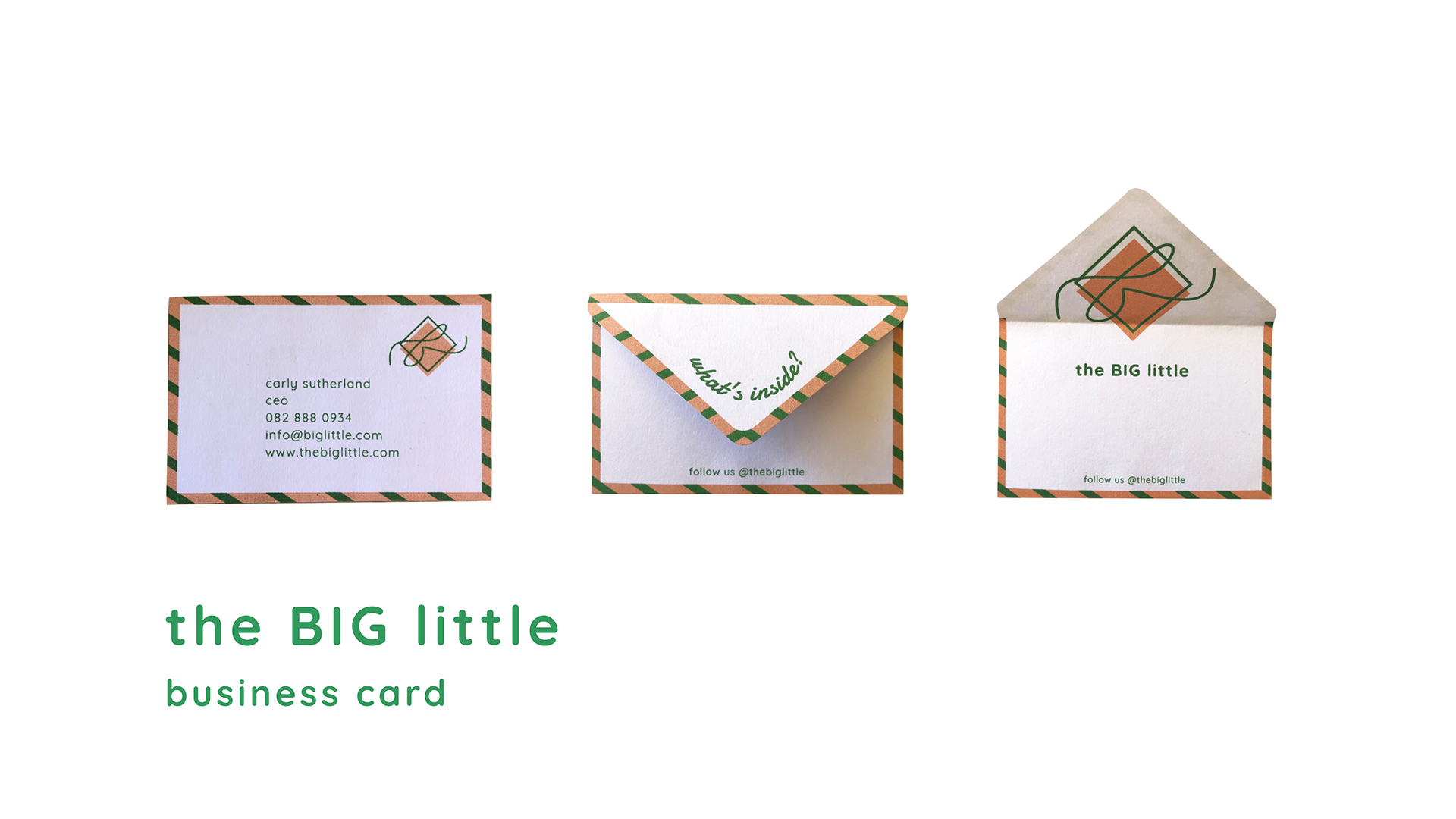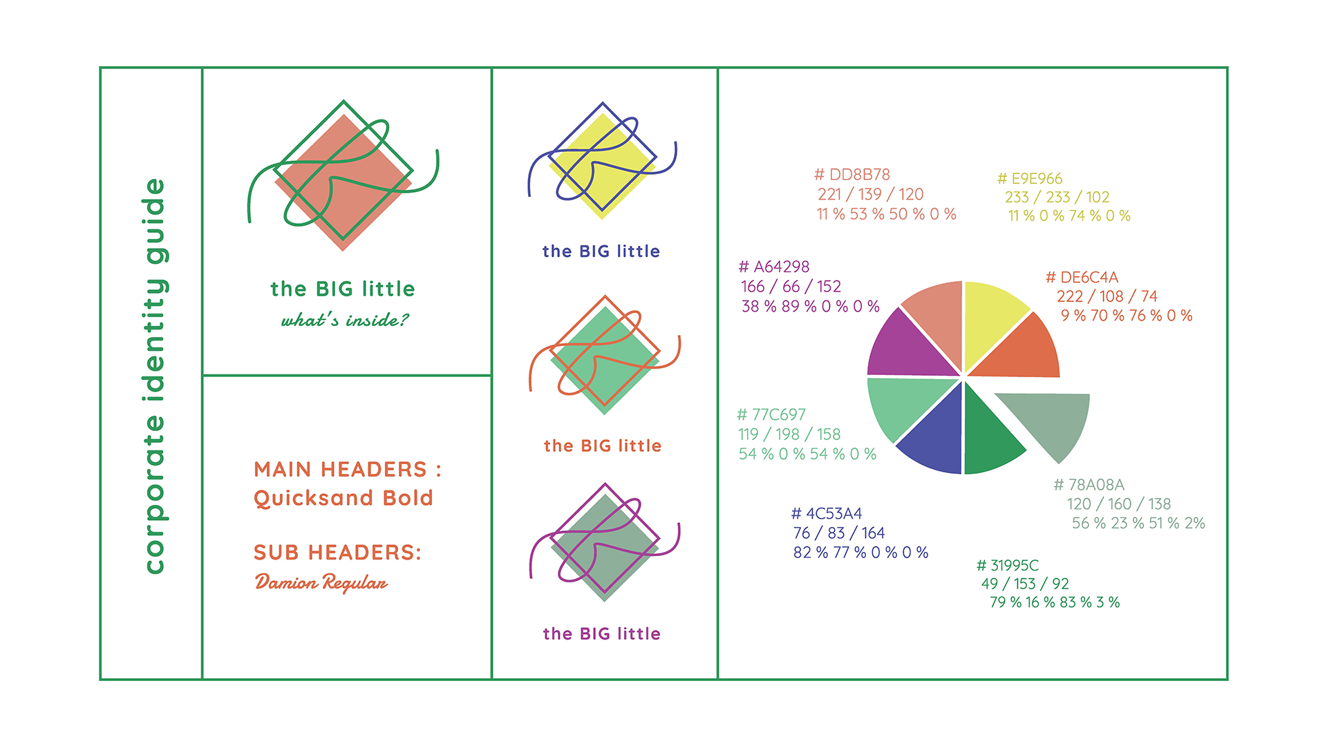 The Big Little is a business idea I want to implement one day. It is an online kids’ gifting store, which specializes in the experience of receiving a gift – from delivery to opening the gift to the actual present inside – hence the tagline “What’s Inside?” The logo and aesthetic are inspired by brightly coloured, cheap sticker packs you used to get in the 90’s, printed badly so the colours don’t match the outlines. The bright colours and fun images appeal to the kids, while the nostalgic element it creates appeals to the grown-ups buying the gifts.