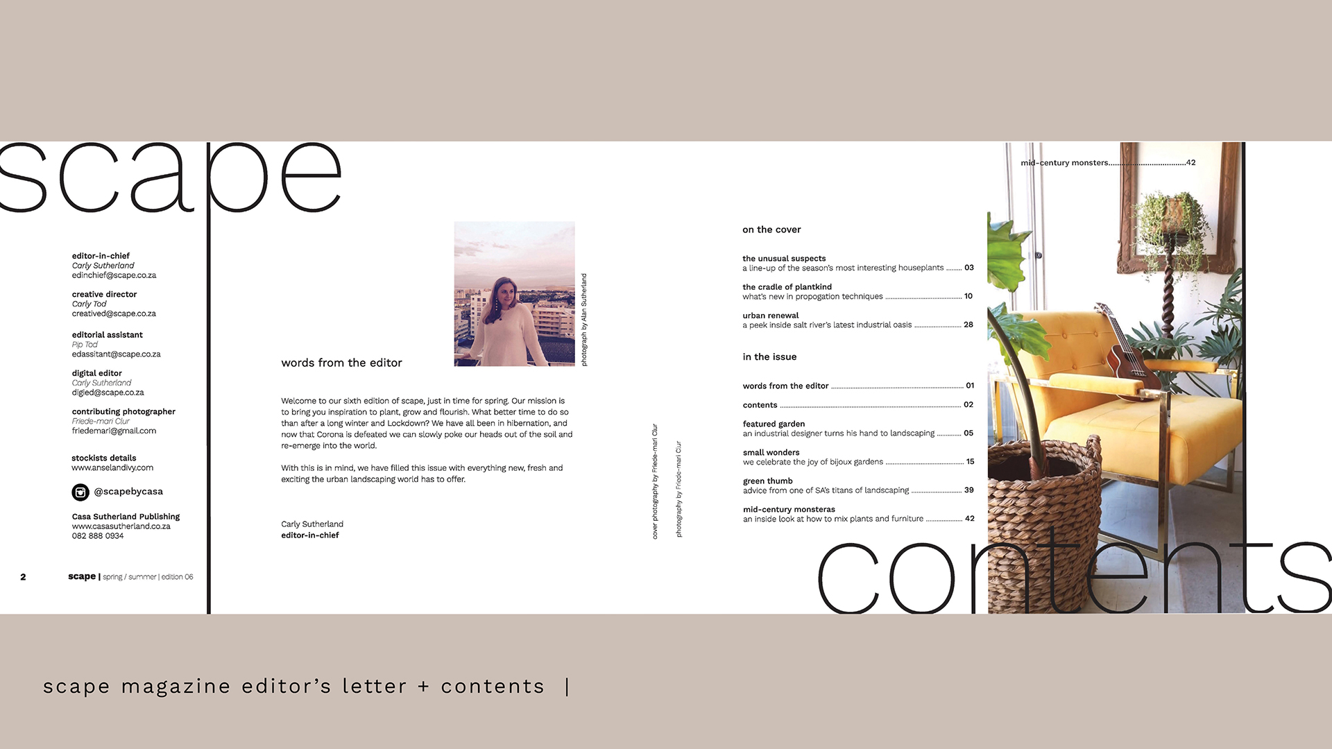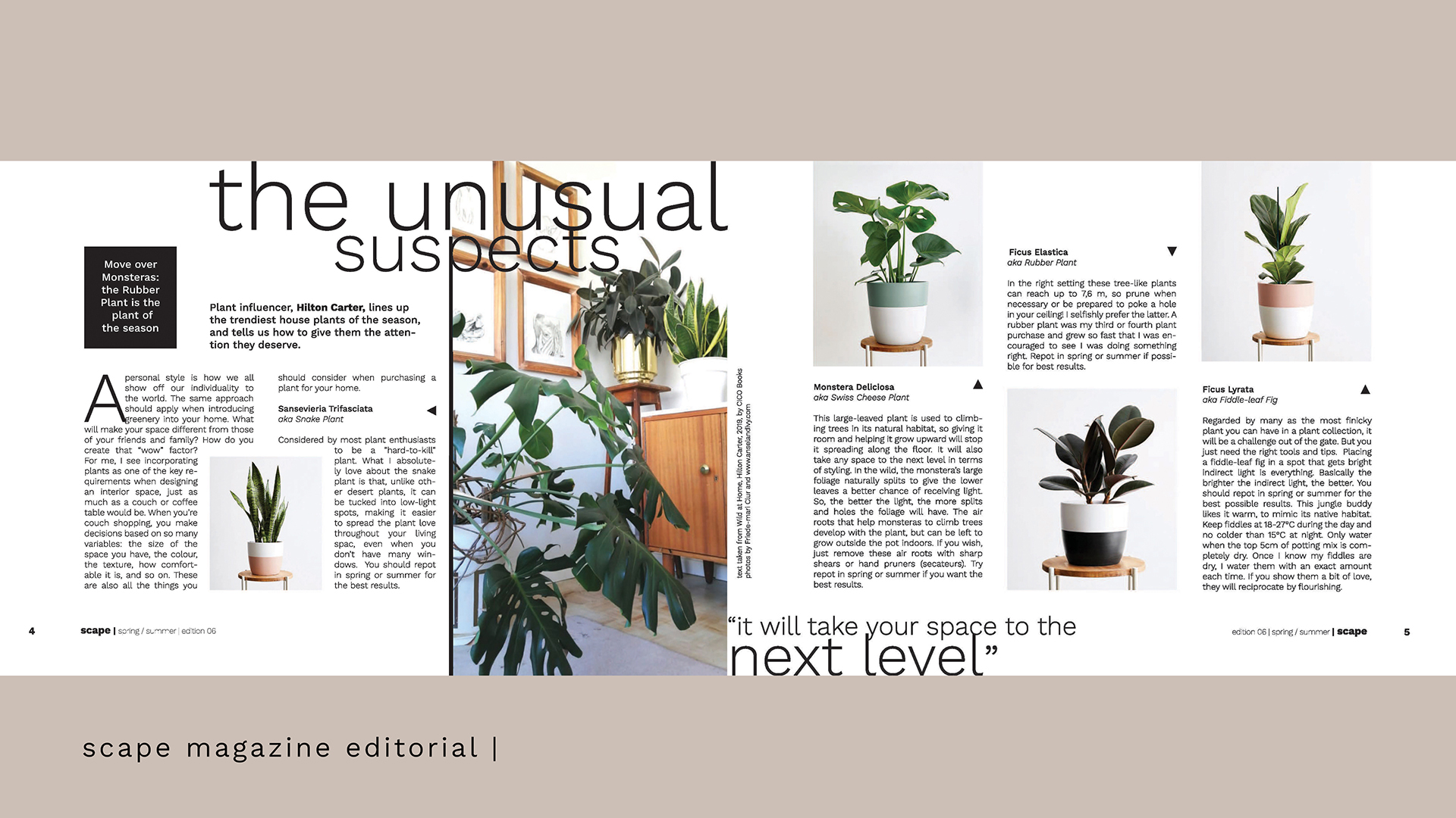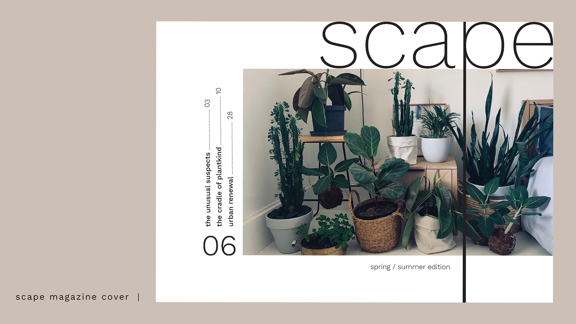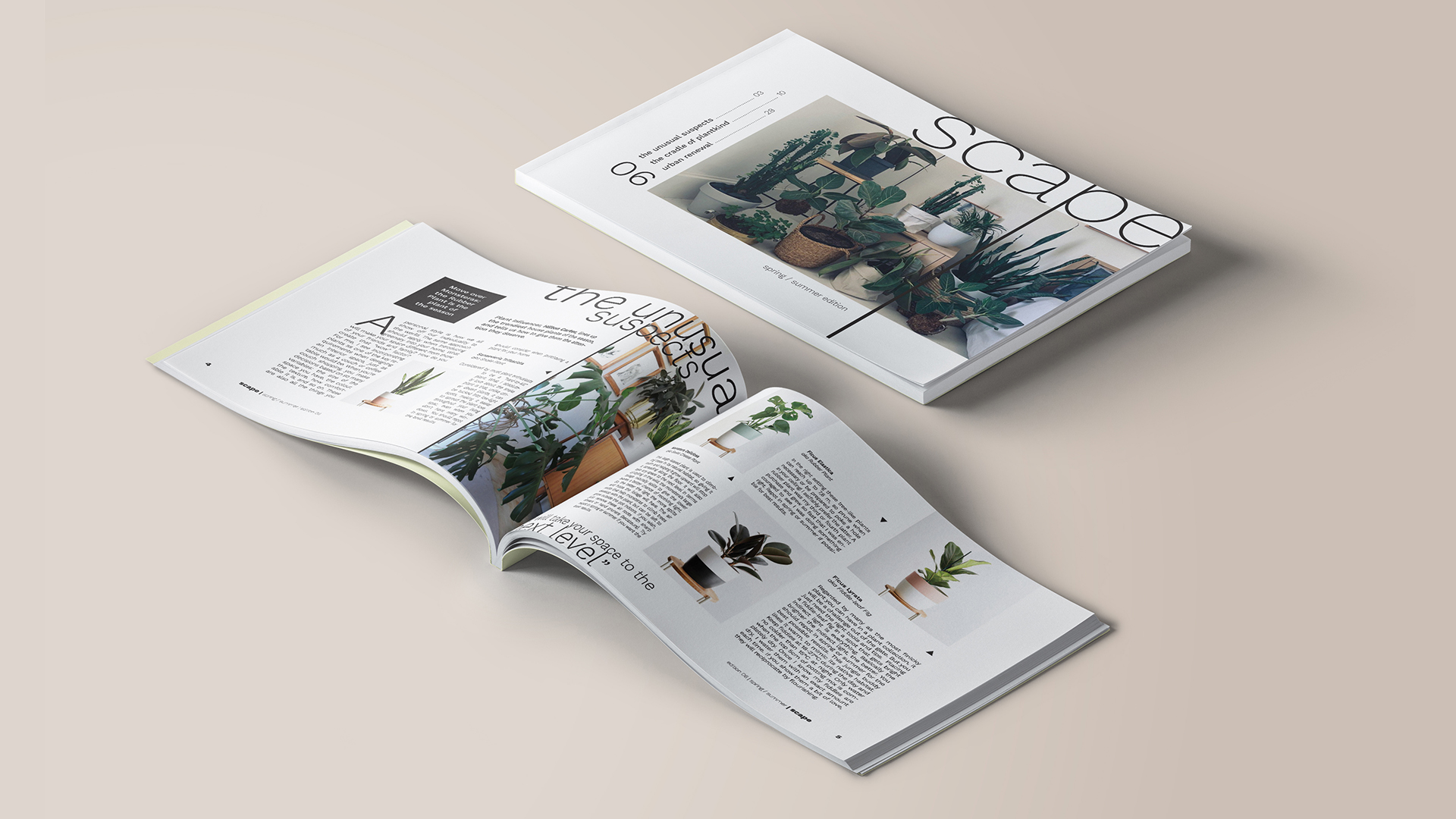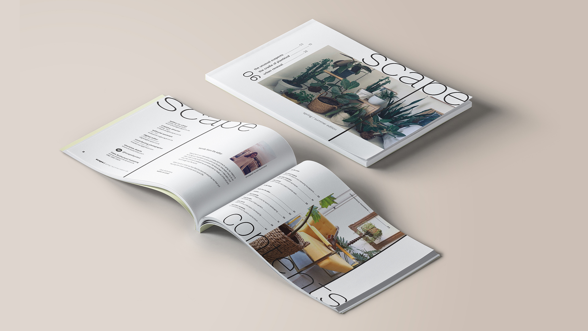 Scape Magazine is a high-end publication focusing on indoor plant landscaping. Its landscape format echoes the name. Its modern and minimal approach appeals to its market, who are interested in modern home decor and design.