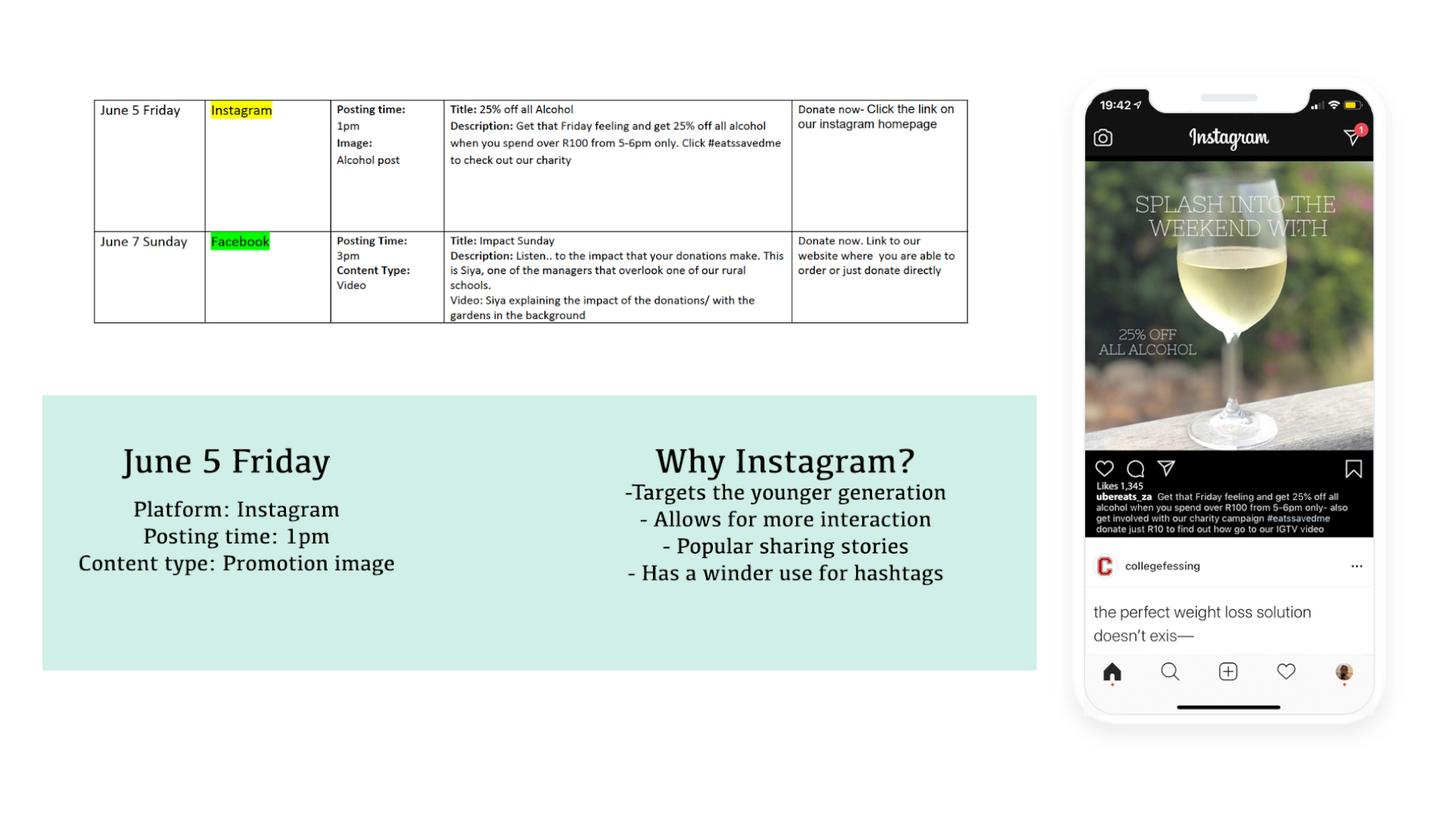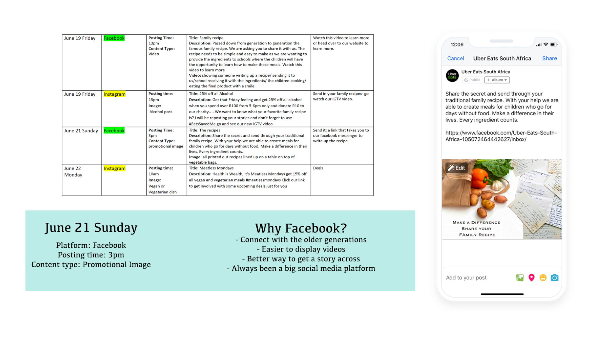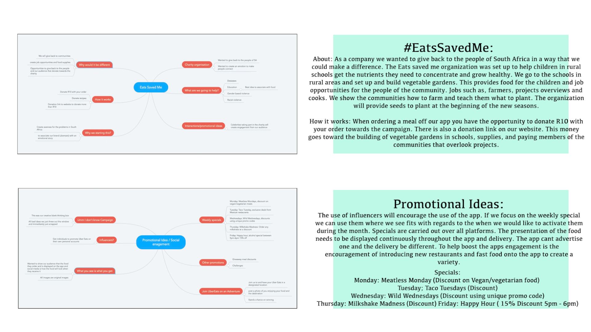We were tasked with creating a campaign and content plan for a company of our choice. The company we selected was UberEATS. The content plan had to be carried out over a month, over various different platforms. We completed a full analysis of the company and created 2 separate target markets and selected platforms that we felt aligned with the company and that would be aligned with the campaign.