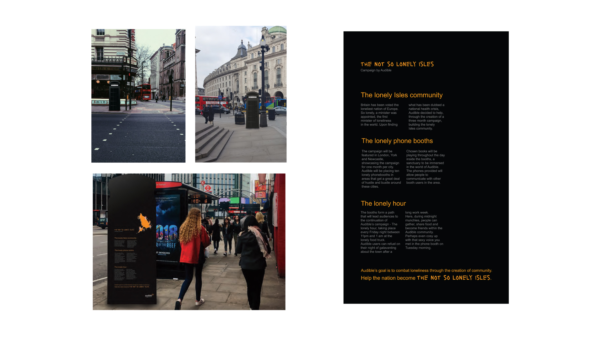Upon finding what has been dubbed a national health crisis, Audible decided to help through the creation of a 3-month campaign building a Lonely Isles community. The goal is to combat loneliness through the creation of communities.